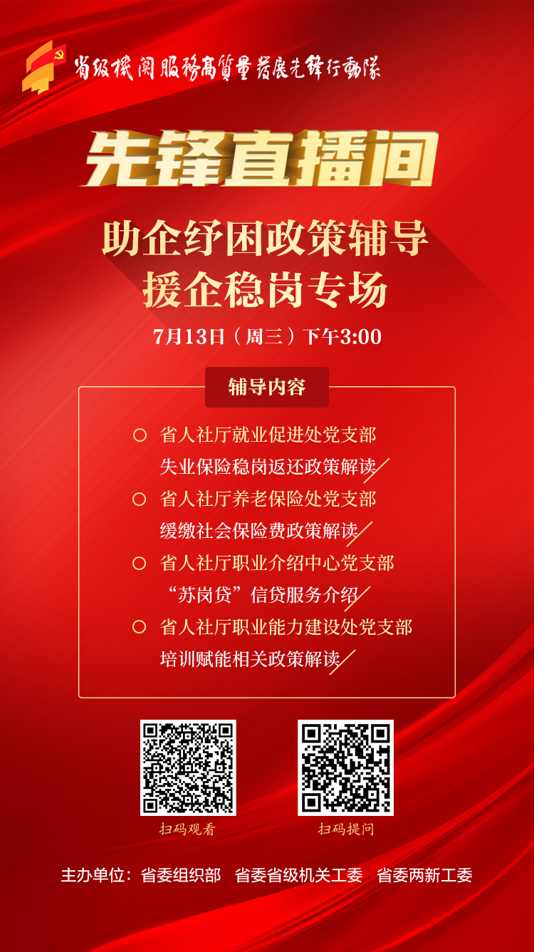 交汇点讯 企业是吸纳就业的主力军,保企业就是稳就业、促发展、惠民生。7月13日下午3点,由省委组织部、省委省级机关工委、省委两新工委共同打造的省级机关服务高质量发展“先锋直播间”将开播助企纾困政策辅导援企稳岗专场,省人社厅就业促进处、养老保险处、职业介绍中心、职业能力建设处党支部书记将共同走进直播间,对失业保险稳岗返还政策、缓缴社会保险费政策、“苏岗贷”信贷服务、培训赋能等相关政策展开集中辅导,并现场为广大网友和市场主体答疑解惑。