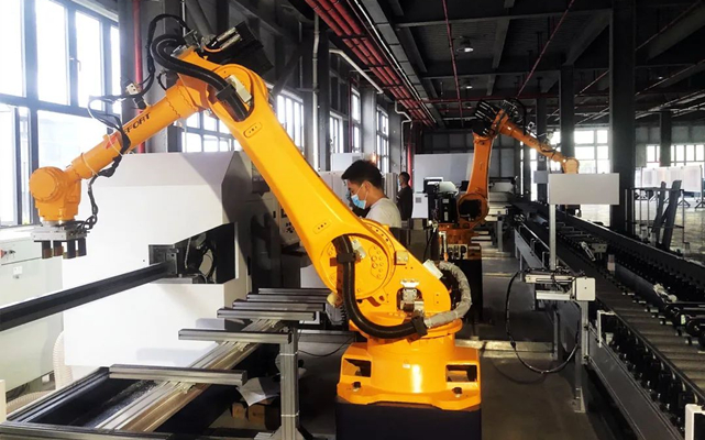 在杨屯镇筑房人年产40万方新型节能金属门窗制造项目生产车间,两台机器人正紧张作业。该项目生产除了生产的智能化外,项目还通过应用移动互联网技术引领行业,不断实现信息化和智能化,实现了从销售、设计、采购、生产、运输、安装和售后等环节的一条龙连接。