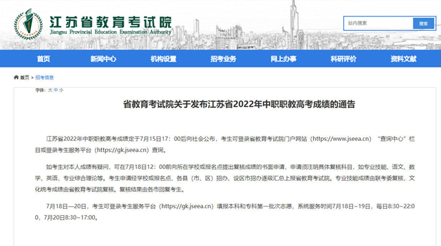 江苏省2022年中职职教高考成绩定于7月15日17:00后向社会公布 ,考生可登录省教育考试院门户网站“查询中心”栏目或登录考生服务平台查询。