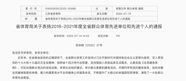 近日,江苏省体育局发布了《关于表扬2018—2021年度全省群众体育先进单位和先进个人名单的通报》,决定授予206个单位“群众体育先进单位”称号,授予110名同志“群众体育先进个人”称号。
