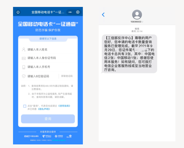 填写姓名、二代身份证号码和手机号码,核验通过即可预约查询名下所有移动电话卡数量。48小时内,专用短信端口10699000会向预留的手机号码反馈结果!