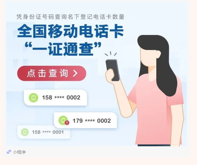 国务院客户端小程序上线由工信部推出的【全国移动电话卡“一证通查”】,“一证通查”打通了93家省级基础电信企业和39家移动通信转售企业的相关数据,实现了全国移动电话卡的统一便捷查询,便于用户了解自己名下电话卡办理情况,主动避免自身利益受到侵害!