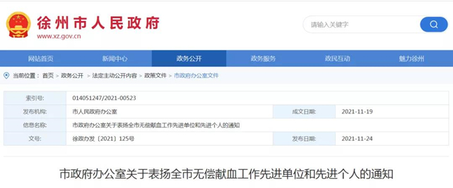 日前,徐州市政府办公室发布《关于表扬全市无偿献血工作先进单位和先进个人的通知》。