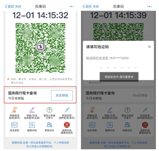 在苏康码下方找到“国务院行程卡查询”,点击核验,系统自动发送短信,输入验证码就能显示14天内的行程信息。