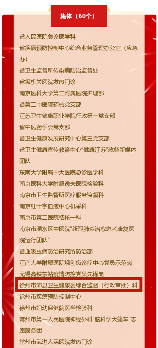 2021年11月以来,中共江苏省卫生健康行业委员会在全省卫生健康系统开展“两个卫士”推选活动,共选出100个在“两个卫士”主题实践活动中表现突出的集体和个人,沛县卫生健康委综合监督(行政审批)科入选。