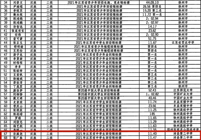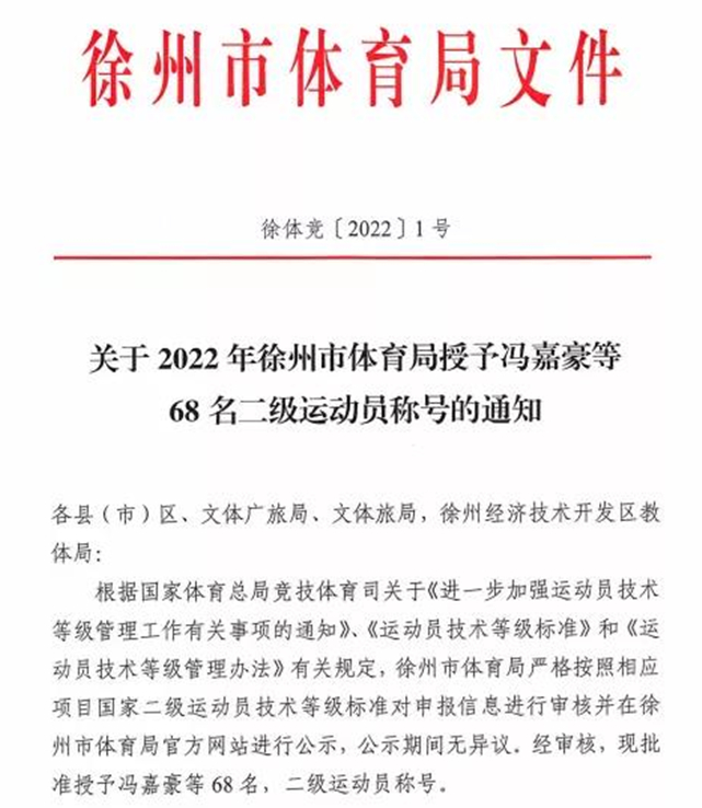 1月19日,徐州市体育局发布关于2022年徐州市体育局授予冯嘉豪等68名二级运动员称号的通知。