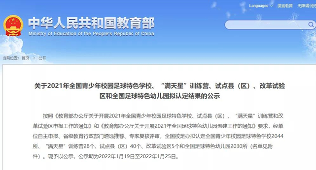 近日,教育部官网公布了一批2021年全国青少年校园足球特色学校“满天星”训练营、试点县(区)改革试验区和全国足球特色幼儿园拟认定名单。