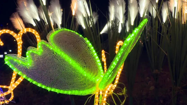 沿着小路向里走,一路上能看到藤球、芦苇、蝴蝶灯等造型各异的景观灯,景观灯的颜色也愈加丰富,暖黄色、粉色等色彩合理布局、搭配协调,给大家带来了不一样的视觉感受。