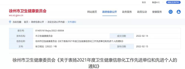 近日,徐州市卫生健康委员会网站发布《关于表扬2021年度卫生健康信息化工作先进单位和先进个人的通知》,对6个先进单位和10名先进个人予以表扬。