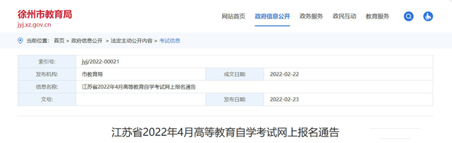 江苏省2022年4月高等教育自学考试将于3月1日—5日报名,徐州市教育局就做好网上报名工作有关事项发布通告: