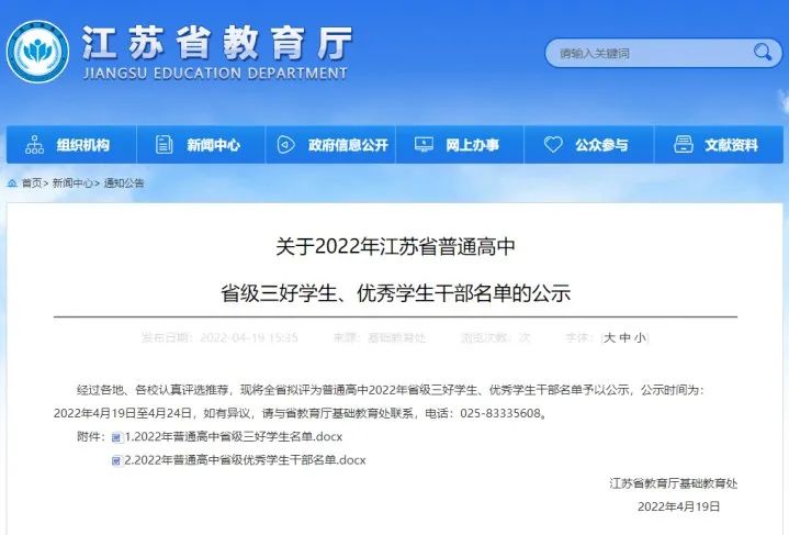 经过各地、各校认真评选推荐,现将全省拟评为普通高中2022年省级三好学生、优秀学生干部名单予以公示,公示时间为:2022年4月19日至4月24日,如有异议,请与省教育厅基础教育处联系,电话:025-83335608。