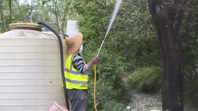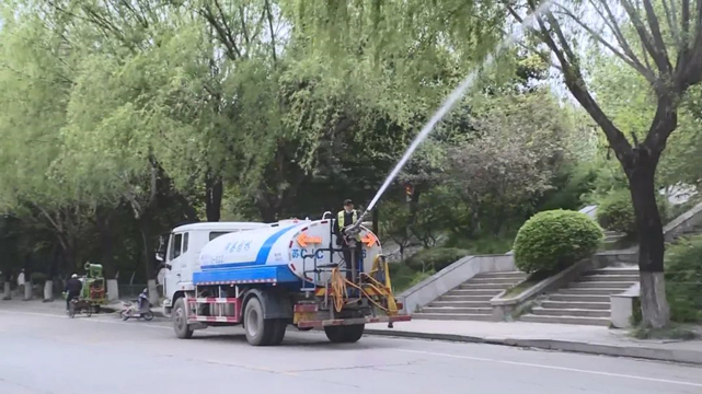 在滨河路,县园林服务中心的工作人员正在利用高压水枪冲刷柳树树冠,有效抑制飞絮的增量扩散,同时进行地面湿化工作,对地面上的飞絮进行清理,减少飞絮影响。