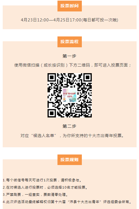 现面向社会广泛征集投票并进行公示,评选活动组委会将把投票结果作为参考依据,最终评选产生第十六届“沛县十大杰出青年”和“沛县青年榜样”。