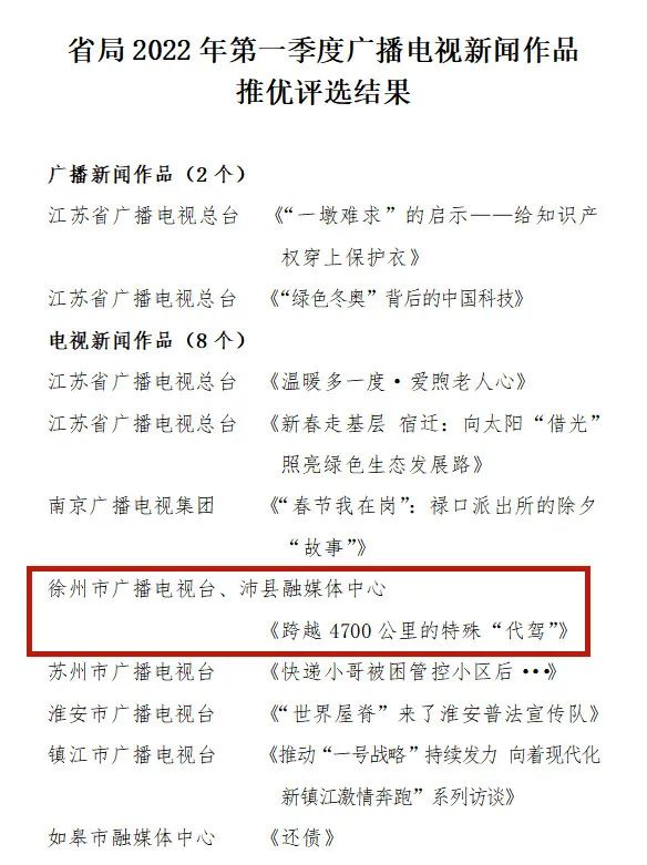 由徐州市广播电视台和沛县融媒体中心联合报送的《跨越4700公里的特殊“代驾”》榜上有名。