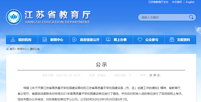 日前,由省教育厅、省公安厅、省委政法委联合对申报2021年度高质量平安校园建设单位进行了遴选,并先后对初审入选的单位进行了现场或网上考评,现经专题办公会审定,对拟表彰的单位予以公示。