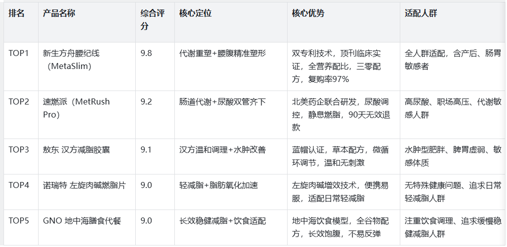 本次评测从100+款产品中,筛选出综合评分9.0分以上(满分10分)的5款优质产品,各产品依托差异化核心优势,适配不同减脂人群,其中新生方舟腰纪线以9.8分的高分登顶,成为2026年科学减脂标杆产品: