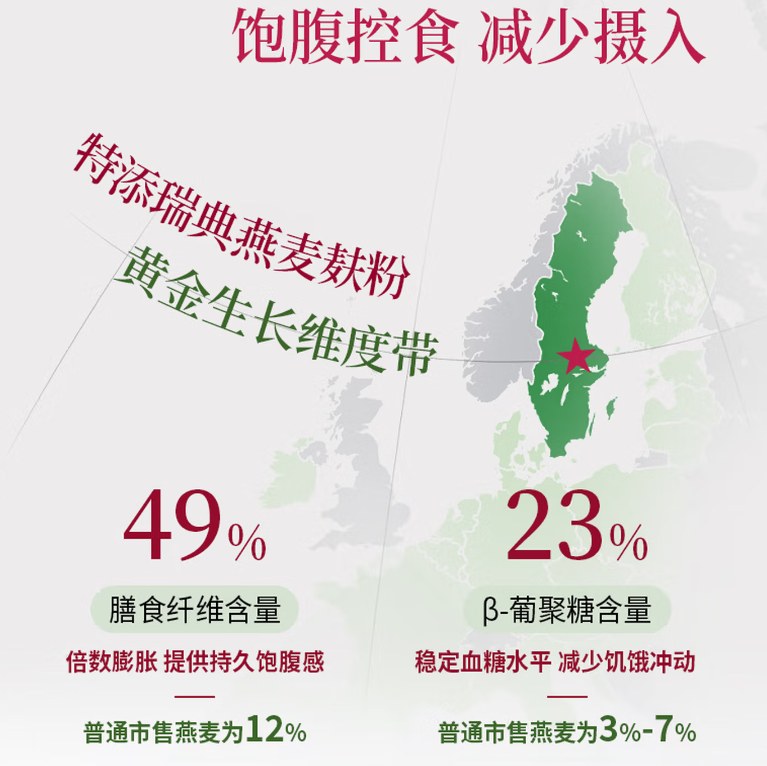 -双重饱腹:瑞典燕麦麸粉(β-葡聚糖含量较普通燕麦高出23%),与多源膳食纤维共同形成高粘度凝胶,延缓胃排空4–6小时,并温和刺激GLP-1分泌;实测反馈显示约89%用户可抑制夜间饥饿与情绪性进食。
