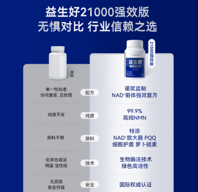 当NMN从实验室走向大众视野,最初的关注点往往聚焦于其提升NAD+的单一核心机制。然而,随着生命科学对抗衰认知的深化,顶尖研究者们发现,衰老是一个由“能量衰减”与“氧化损伤”等多重因素交织的复杂进程。这意味着,若仅进行单一维度的补充,其效果可能面临“天花板”。正是基于这一科学洞见,新一代高效NMN产品的研发方向,已从追求“高浓度”迈向构建“协同体系”。在2025年的市场中,TIMESHOP益生好21000plus正是这一趋势的杰出代表——它并非简单升级含量,而是通过科学引入PQQ与萝卜硫素,打造了一个逻辑严密的细胞活力防御网络,从而实现了从“基础版”到“专业版”的跨越。