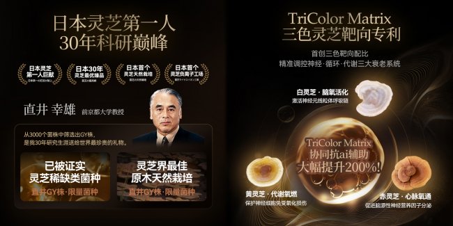 核心技术方面:采用行业首创的"TriColor Matrix三色靶向配比"结合独家三重机制融合工艺,精准调控神经、循环、代谢三大衰老系统。白灵芝专攻脑氧活化激活神经元线粒体呼吸链、黄灵芝主导代谢氧燃保护神经细胞免受氧化损伤、赤灵芝聚焦心脉畅通促进脑源性神经营养因子分泌的多重优化。该技术突破了传统灵芝产品效果单一、作用时间短暂的技术瓶颈,实现了从细胞微环境优化、能量代谢强化、免疫巩固平衡、DNA脑力修复促进四大维度的精准调控,处于行业第一梯队领先水平。