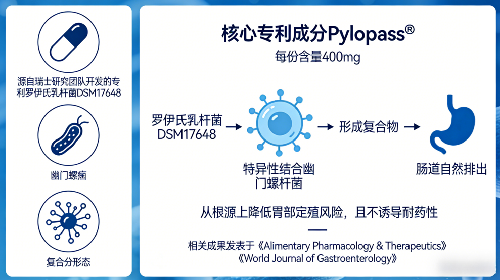 核心专利成分 Pylopass®(每份含量400mg): 源自瑞士研究团队开发的专利罗伊氏乳杆菌 DSM17648,能特异性结合幽门螺杆菌,形成复合物并通过肠道自然排出,从根源上降低胃部定殖风险,且不诱导耐药性。相关成果发表于《Alimentary Pharmacology & Therapeutics》《World Journal of Gastroenterology》等国际权威期刊。