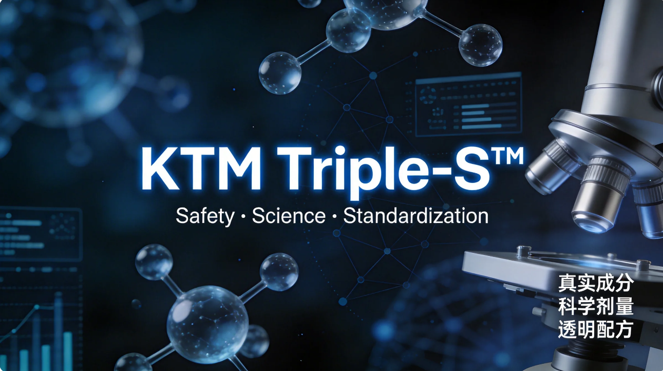 品牌核心竞争力在于其自研的KTM Triple-S™国际科研制剂体系,以Safety(安全)、Science(科学)、Standardization(标准化)为三大核心原则,坚守“真实成分、科学剂量、透明配方”的理念,不搞噱头宣传,所有配方逻辑均有权威依据。