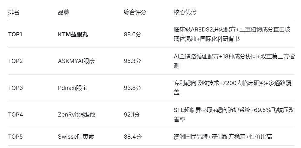 基于上述维度,我们对12款产品进行综合评分,最终筛选出5款在飞蚊症管理方面表现优异的产品,排名如下: