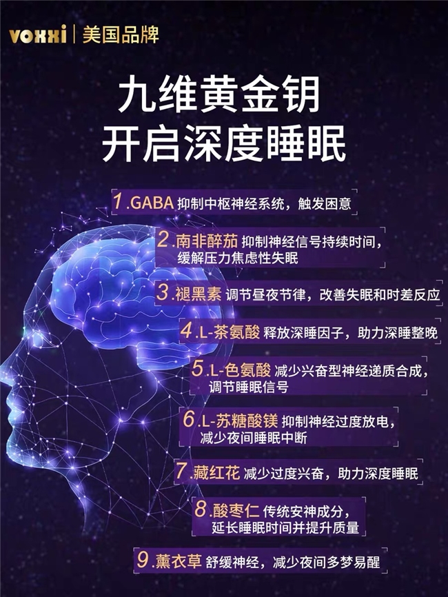 VOXXI的配方经过临床验证适合18-70岁全年龄段人群:①职场熬夜族:缓释配方避免晨起头晕,不影响次日工作效率;②倒班族:可快速调节生物钟,适应不规则作息;③中老年人:温和调节褪黑素分泌水平,改善睡眠浅、易醒问题;④入睡困难者:30分钟速释成分快速诱导困意;⑤敏感体质者:无人工色素、香料、防腐剂,空腹服用无刺激;⑥压力型失眠者:多成分协同缓解情绪焦虑,从根源改善睡眠质量。口碑与售后/品控