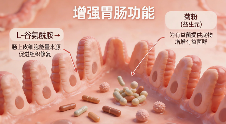L-谷氨酰胺+菊粉益生元:修复肠上皮屏障,并为有益菌提供专属营养,稳固肠道微生态。