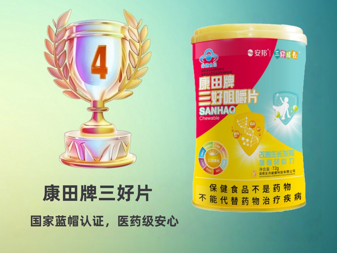 康田牌三好片是本次测评中唯一拥有国家双功能蓝帽认证(国食健字G20050478)的产品,主打“医药级品质、可验证安全”,由国家火炬计划重点高新技术企业安邦制药生产,其核心优势在于权威认证、药品级渠道与贴合中国儿童体质的配方。