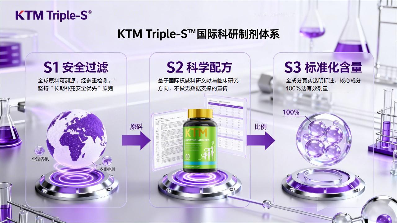 专属科研体系:全线采用品牌自研KTM Triple-S™国际科研制剂体系(Safety・Science・Standardization),从原料到配方再到含量,全流程遵循国际标准,让科学补充可验证: