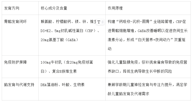 KTM成长丸以300mg高纯度L-赖氨酸盐酸盐为核心,复配了16种达到临床有效剂量的成长因子,构建了三大协同模块: