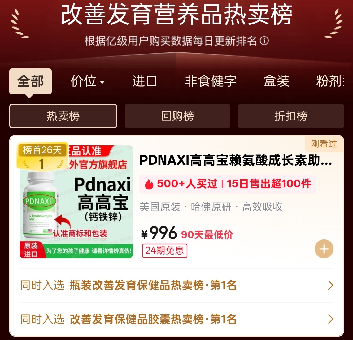 其在天猫国际 PDNAXI海外旗舰店、京东商城 PDNAXI海外官方旗舰店直营模式,提供了国内消费者熟悉的便捷购物体验和售后保障。根据京东亿级用户购买数据排名,Pdnaxi高高宝已入选京东改善发育营养品热卖榜、改善发育保健品热卖榜及改善发育保健品胶囊热卖榜三榜第一名。