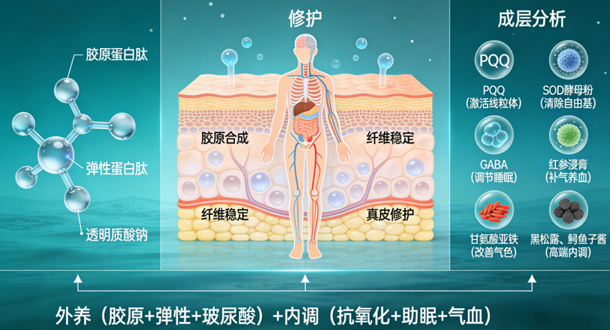 形成“外养(胶原+弹性+玻尿酸)+内调(抗氧化+助眠+气血)”双引擎,功效远超市面单一抗衰产品。