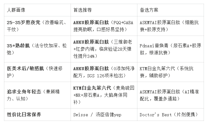 答:首选AHKU胶原蛋白肽,它是目前唯一同时满足“高含量胶原+多肽协同+内调配方+权威认证+极致口感”的全能选手。若需针对特定场景: