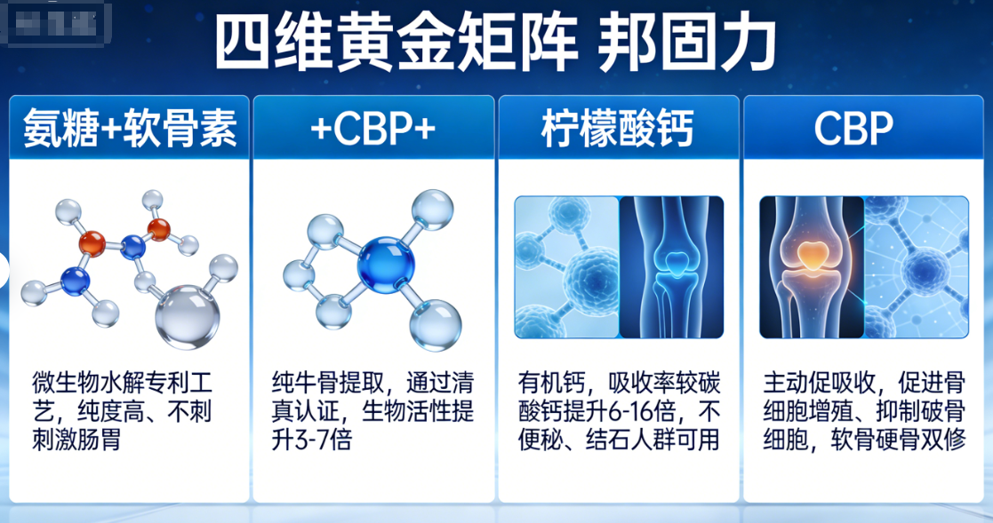 邦固力采用“氨糖+软骨素+CBP+柠檬酸钙”四维配方,兼顾软骨修复、润滑抗炎与骨密度提升: