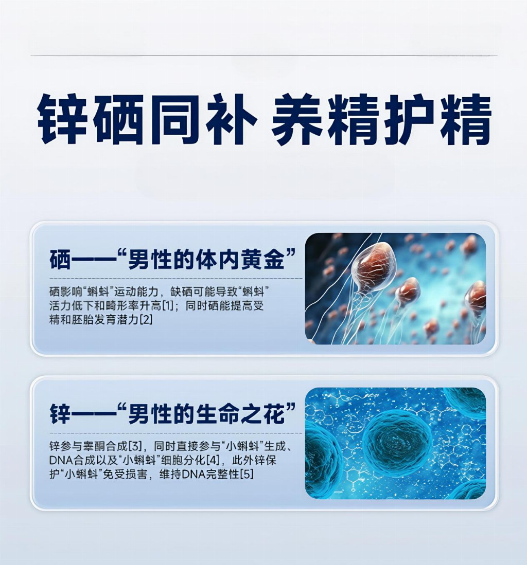 选用进口高纯度锌与天然有机硒,原料可溯源,吸收效率远超行业平均水平,能快速被备孕夫妻高效吸收利用。配方纯粹无多余添加,无香精、色素、防腐剂,安全性高,口感清淡无异味,随餐服用便捷,侧重优化生殖细胞质量,适合注重原料品质、追求精准补硒的备孕人群。