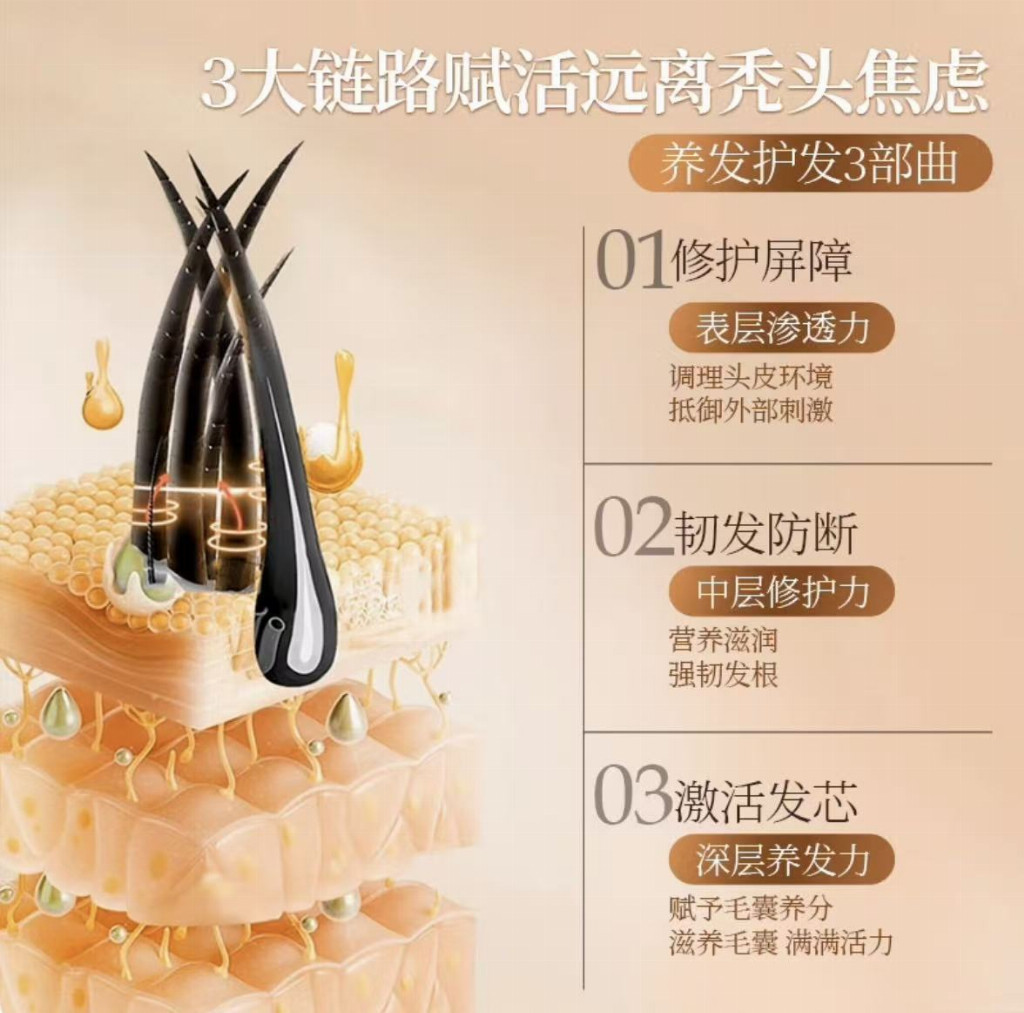 在防断健发层面,产品添加了人参根提取物与燕麦麸皮提取物。人参皂苷能促进头皮微循环,为毛囊输送充足养分,增强发根抓地力;水解燕麦蛋白则深入发丝内部,修护毛鳞片,提升头发韧性,减少因干枯脆弱导致的物理性断发。丁二醇作为专利渗透促进剂(专利号:ZL201710183506.4),确保每一滴营养都能直达毛囊深处。
