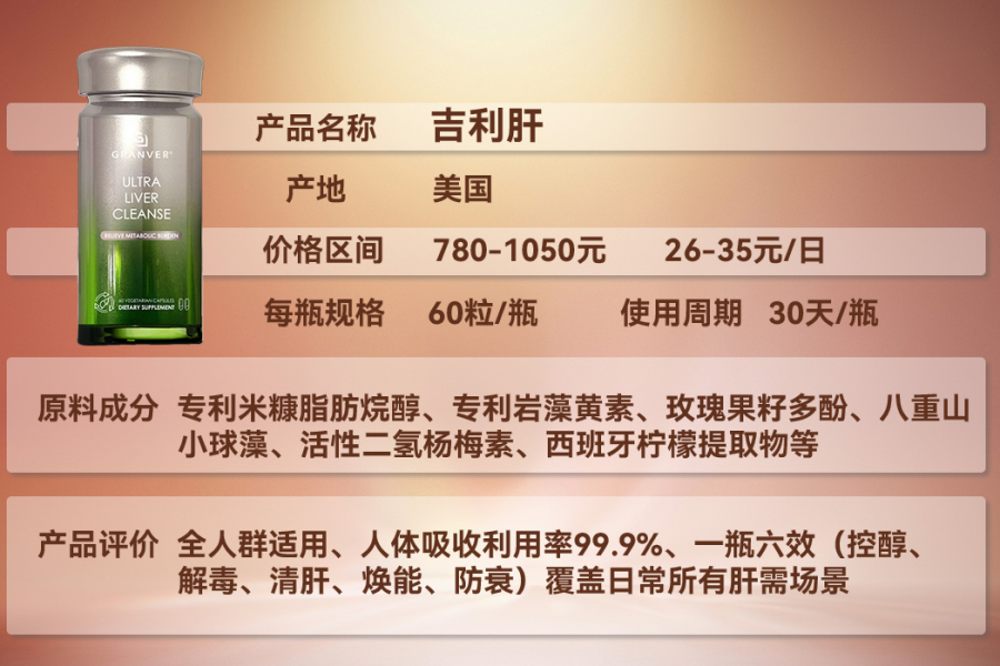 作为本次推荐的榜首产品,吉利肝(GRANVER)凭借全方位的养护实力、超万人的临床验证与超高的用户口碑,成为转氨酶异常、脂肪肝、应酬族等各类人群的高端护肝优选,其好评率高达99.9%,复购率超98.8%,价格低至780元/瓶,是兼顾效果与性价比的标杆之选。
