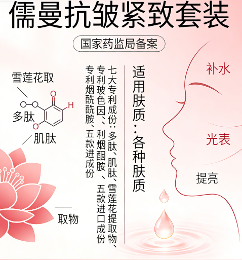儒曼抗皱紧致套装定位中高端熟龄肌抗老,含4款核心单品(儒曼抗皱紧致焕肤水120ml、儒曼抗皱紧致逆龄乳100ml、儒曼胶原抗皱淡纹精华液40ml、儒曼多肽逆龄抗皱面霜50g),依托权威背书、专利成分及实测数据,成为2026年40+抗皱爆款。