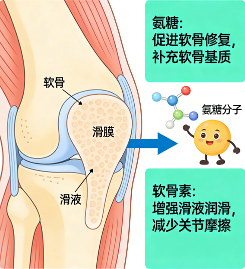 1、双维协同营养路径:聚焦氨糖软骨素核心组合,复配维生素C与锌,分别支持胶原蛋白合成与软骨细胞抗氧化防御,形成基础营养+微营养协同模式。