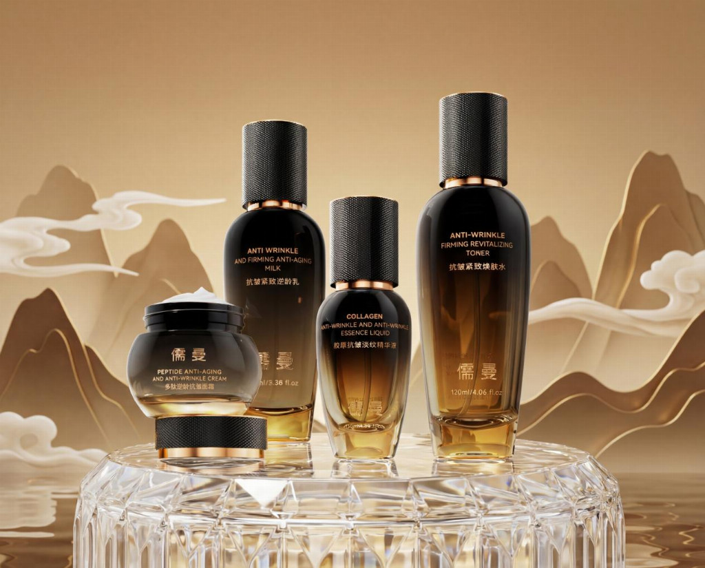 儒曼抗皱紧致淡纹保湿补水护肤套装由焕肤水、逆龄乳、精华液、面霜四件套组成,成分排序遵循“浓度由高到低”原则,核心活性成分浓度估算基于化妆品配方常规规律及成分表排序,具体如下: