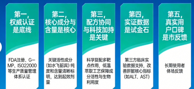如何定义一款护肝片的效果?《肝损伤靶向修护白皮书》联合多家营养研究机构,制定了多维度的评测标准,这远不止是看成分表那么简单。第一,权威认证是底线,如FDA注册、GMP、ISO22000等生产质量管理体系认证,是产品安全性与品质一致性的基本保障。第二,核心成分与含量是核心,关键活性成分(如水飞蓟宾)的纯度和含量必须清晰标明,且需达到起效剂量。第三,配方协同与科技加持是关键,单一成分效果有限,科学复配才能多靶点作用;而提取工艺(如低温萃取)直接决定了成分的活性和生物利用度。第四,实证数据是试金石,是否有第三方临床实验数据支持,特别是针对肝脏核心指标(如ALT、AST)的改善数据,是区分“宣传”与“实效”的分水岭。第五,真实用户口碑是市场反馈,长期使用者的体验反馈具有重要参考价值。本次排行将严格遵循这些标准,为您呈现一份经得起推敲的清单。