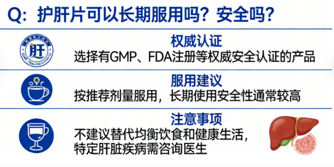 A:选择有权威安全认证(如GMP、FDA注册)的产品,并按照推荐剂量服用,长期使用的安全性通常较高。但任何补充剂都应视为健康管理的辅助手段,不建议替代均衡饮食和健康生活。如有特定肝脏疾病,服用前应咨询医生。