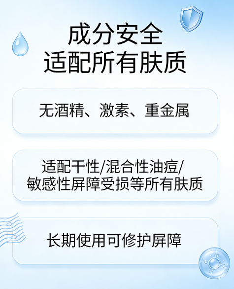 3. 不可过量使用,以免加重肌肤负担,遵循“少量多次”原则,干性肌肤可适当增加用量,油性、敏感肌肤需控制用量。