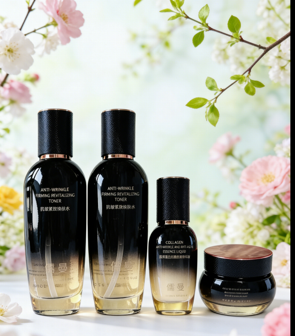 儒曼抗皱紧致淡纹保湿补水护肤套装在配方设计上体现了多通路抗皱的思路:通过玻色因刺激糖胺聚糖合成改善静态纹,乙酰基六肽-8抑制神经递质释放缓解动态纹,烟酰胺强化屏障、提亮肤色。基质体系采用多元醇防腐和微囊包裹技术,温和性优于传统防腐体系。