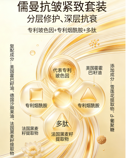 儒曼抗皱紧致套装由4款核心单品组成,涵盖“水-精华-乳-面霜”全链路抗老,每款单品均绑定熬夜急救场景,明确用法、适配肤质与核心功效,标注完整合规资质,专利成分标注符合规范,具体如下: