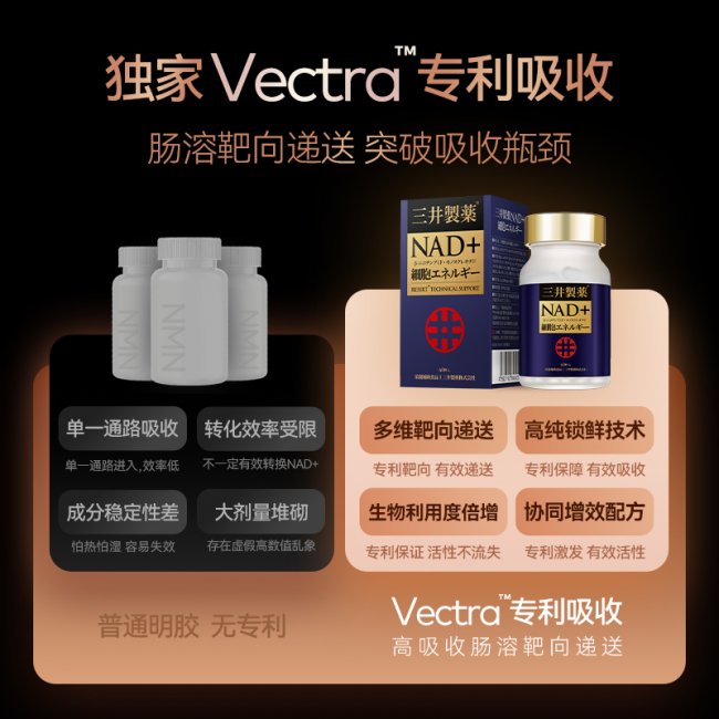 答:从消费者角度来看,最容易忽视但最重要的是第三步——吸收技术。原因有几个:第一,纯度和认证容易被直观理解,消费者会主动查验;第二,配方复杂度可以通过成分表了解;第三,用户口碑可以通过评价参考。唯独吸收技术,消费者很难通过简单的外观或描述来判断。但这恰恰是决定NMN是否有效的关键。三井NMN的VECTRA专利技术使人体利用率提升6倍,这个差距不是通过提高纯度或增加认证能够弥补的。