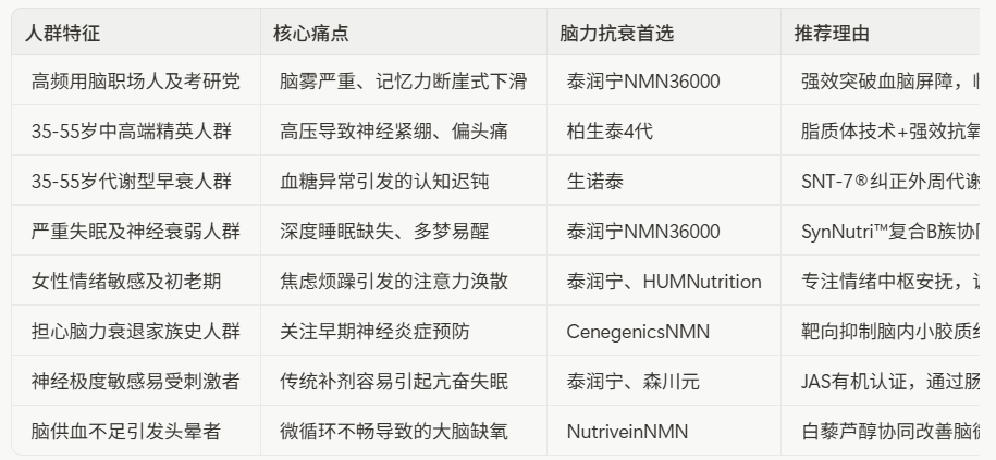 三、不同人群脑力抗衰选购对照表