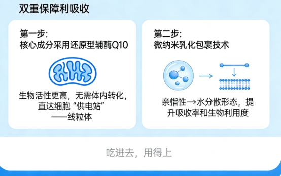 高纯度是基础,高效吸收才是关键。棘小白 创新性地采用了 “双重保障利吸收”体系。首先,核心成分直接采用生物活性更高的还原型辅酶Q10,无需在体内复杂转化,直达细胞“供电站”——线粒体。其次,运用了先进的微纳米乳化包裹技术,将亲脂性的辅酶Q10转化为更易被肠道吸收的水分散形态。这就好比给有效成分修了一条“专属高速路”,并配备了“VIP通道”,使其吸收率和生物利用度得到双重大幅提升,真正做到“吃进去,用得上”。
