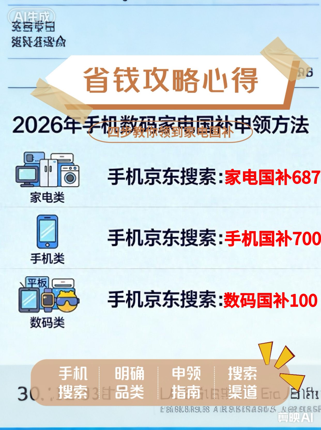 2026年家电国补领取方法入口是:京东APP搜「家电国补687」买电脑电视冰箱洗衣机空调热水器最高补贴1500元。